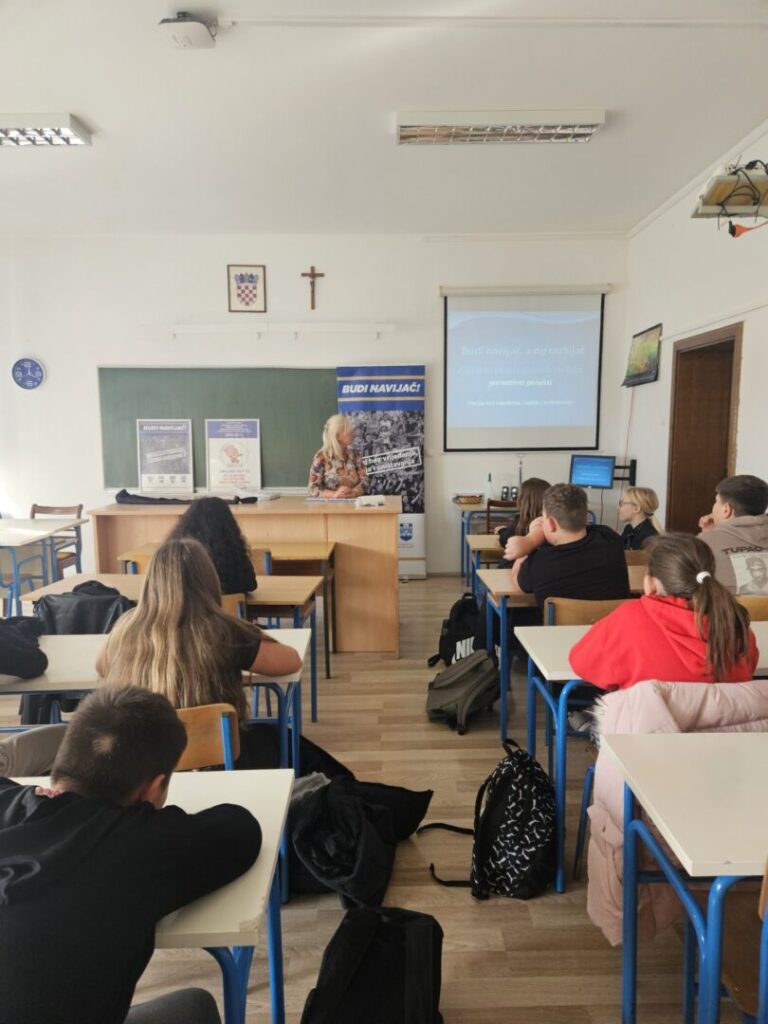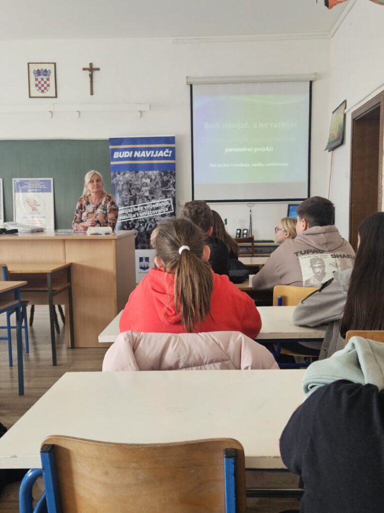 Dana 21. listopada 2025. u našoj je školi održano interaktivno predavanje u sklopu preventivnog projekta “Budi navijač, ne razbijač”. Predavanje je održala policijska službenica Larisa Kovač, s Odjela za prevenciju PU Osječko-baranjske županije. Cilj je predavanja, namijenjeno učenicima 6. razreda, ukazati na nužnost poštivanja pravila na javnim događajima te objasniti zakonske propise u vezi ponašanja na sportskim događajima i kako uopće biti siguran na okupljanima većeg broja ljudi. Da je učenicima predavanje bilo zanimljivo i korisno, dokazuje njihovo zainteresirano slušanje predavanja i pitanja upućena policijskoj službenici.