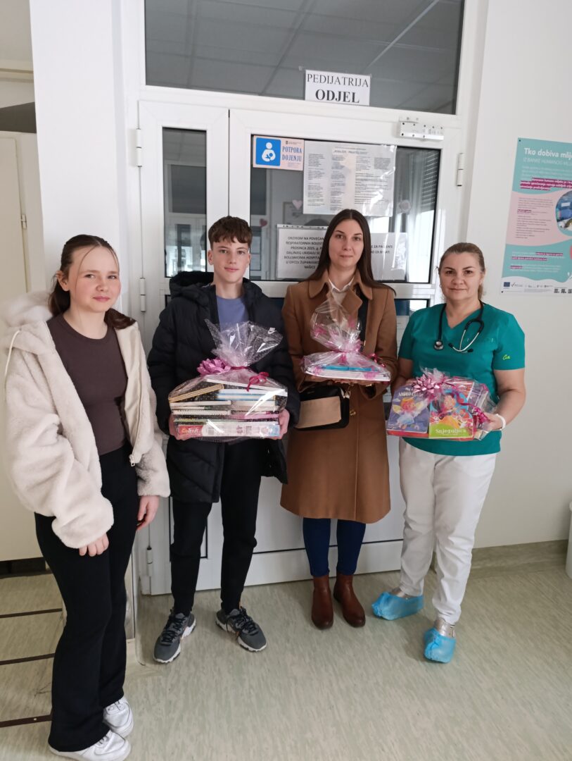 Povodom Nacionalnog dana djeteta oboljelog od maligne bolesti, koji se obilježava 15. veljače, naša je škola organizirala Sajam školskog pribora i sitnica. Sajam se održao u tjednu od 26. do 30. siječnja 2026. te su se sva prikupljena sredstva utrošila za kupnju slikovnica, bajki, bojanki i bojica za Odjel pedijatrije OŽB Našice. Tako su dana 19. veljače 2026. godine predsjednik Vijeća učenika Filip Torčić i predstavnica Vijeća učenika 7. razreda Ema Mucafir, zajedno sa školskom pedagoginjom Josipom Ćurković Sekula, osobno uručili donaciju dr. med. Gabrijeli Rendulić Wolf, rukovoditeljici Odjela pedijatrije.