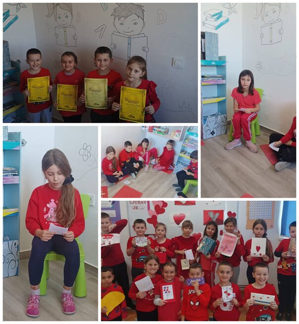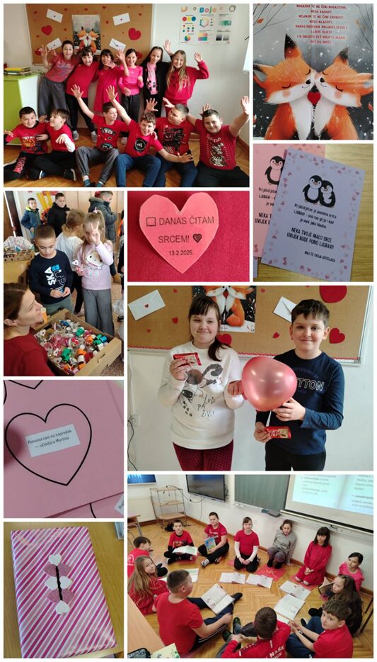 Posebno svečano bilo je u petak, 13. veljače, kada su učenici nosili crvene majice te obilježili i Svjetski dan čitanja naglas. Tom prigodom učenici 1. i 2. razreda, koji su bili najuspješniji u čitanju, dobili su diplome za svoj trud i napredak. Učenici 3. i 4. razreda tijekom cijelog su dana ponosno nosili bedževe sa sloganom „Danas čitam srcem“, dodatno naglašavajući važnost čitanja i ljubavi prema knjizi.