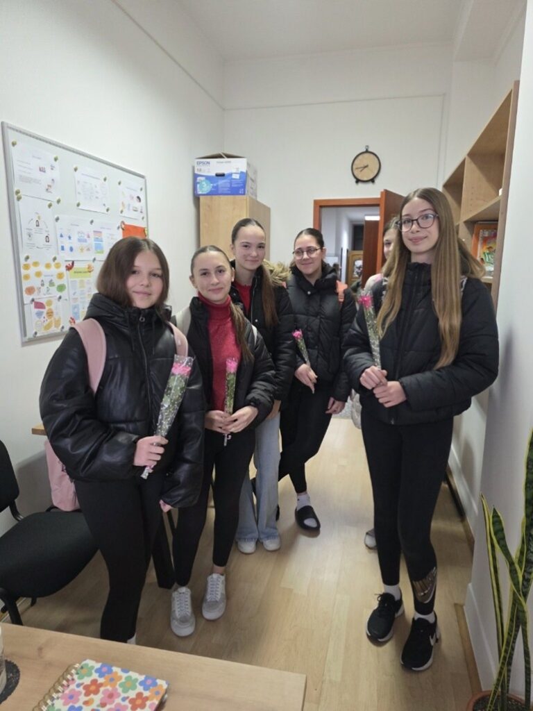 Učenice 8. razreda razveselile su svakog učitelja i djelatnika ružom, koju su osobno uručile uz osmijeh i lijepu riječ. U zbornici su pripremile i slatko iznenađenje – Rafaello kuglice.